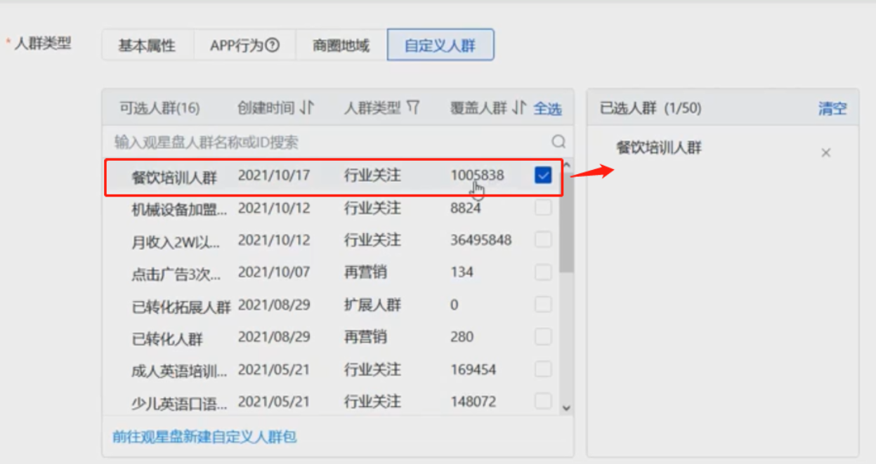 选择“新建人群”,然后选择“自定义人群”此时,之前添加的人群包会出现在列表中